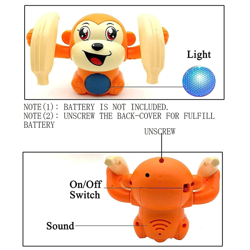 • OPERATION: After the little monkey automatically sleeps, let the little monkey continue to run by clapping, hitting, and speaking loudly. 360 Degree Spinning and Dancing Monkey, It has Light and Sound Effects (SENSOR OPERATED)