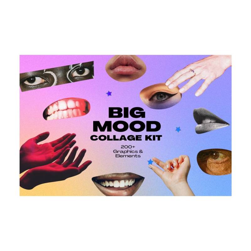 Big Mood collage kit features more than 200 cut-outs of Hands, Eyes, and Mouth. These can be used to add bold extra flavor to a variety of designs, art, and merchandise. Also includes custom hand-made collage elements like paint brush strokes and colorful paper scraps.