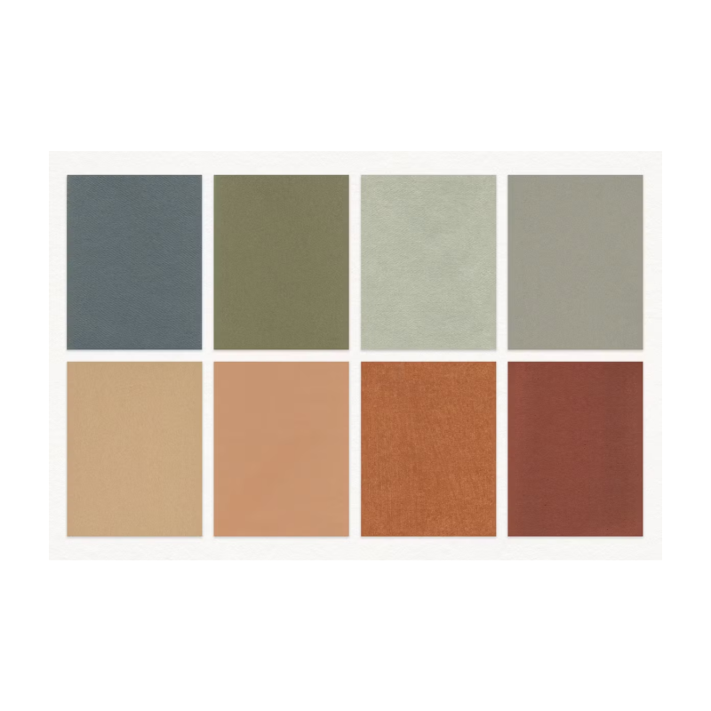 The paper texture surfaces range from soft to grainy to rough or smooth with speckles and particles in most of the papers giving a great organic feel. The papers come in a range of natural colors including off-white, tan, gray, and blue.