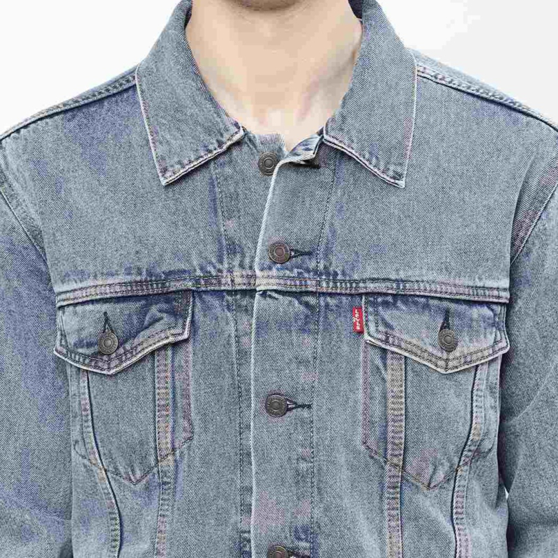 Blue washed waterless denim trucker jacket, has a spread collar, 4 pockets, button closure, long sleeves, straight hem, and cotton lining.