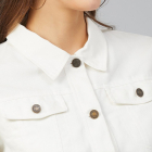 White solid jacket, has a spread collar, 2 pockets, button closure, long sleeves, straight hem, and cotton